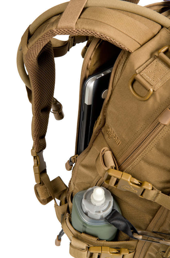 Der Helikon Direct Action Dragon Egg® Rucksack mit einer Kapazität von 25 Litern konzipiert für den Einsatz bei kurzen Patrouillen oder für den normalen täglichen Gebrauch. Der Rucksack bietet 2 Trinkblasen-Taschen, eine im Hauptfach und eine weitere mit Reißverschluss im Rückenteil. Die hintere Tasche kann dank gepolsterter Halterungen für den sicheren Transport von Multi-Band-Funkgeräten oder einem Notebook bis 15 Zoll verwendet werden. Die Vordertasche des Direct Action® Dragon Egg® bietet eine Mesh-Netz-Tasche mit Reißverschluss und einen Organizer für kleinere Gegenstände. In den zusätzlichen Seitentaschen können kleine und flache Gegenstände untergebracht werden, in geöffnetem Zustand passend für Feldflaschen nach US-Standard. Die mit Laser geschnittenen Öffnungen sind MOLLE / PALS kompatibel und machen den Rucksack vollständig modular, bleiben dabei aber unauffällig. Durch seine Ei-Form hat der Dragon Egg® eine geringere Höhe und Breite als Rucksäcke mit vergleichbarer Kapazität und macht ihn so komfortabler beim Tragen mit Koppeltragehilfen oder ballistischen Schutzwesten. Das Federungssystem basiert auf bequemen Schulterriemen und einer Innenversteifung im Rückenteil. Das Material besteht aus strapazierfähigem 500D Cordura® Nylon-Gewebe mit wasserabweisender Beschichtung. Das im Rucksack verwendete innovative Belüftungssystem (Combat-Vent-System®) bietet besseren Trage-Komfort für den Nutzer. Hergestellt aus geschwungenen Schaumstoffprofilen mit mehreren Luftkanälen, in Verbindung mit luftigem CVS®-Netz-Gewebe-Material, trennt es den Rucksack vom Rücken, verbessert die Luftzirkulation und verhindert Wärmestau und Schwitzen, der versteifte Schaum sorgt für mehr Komfort und Stabilität.