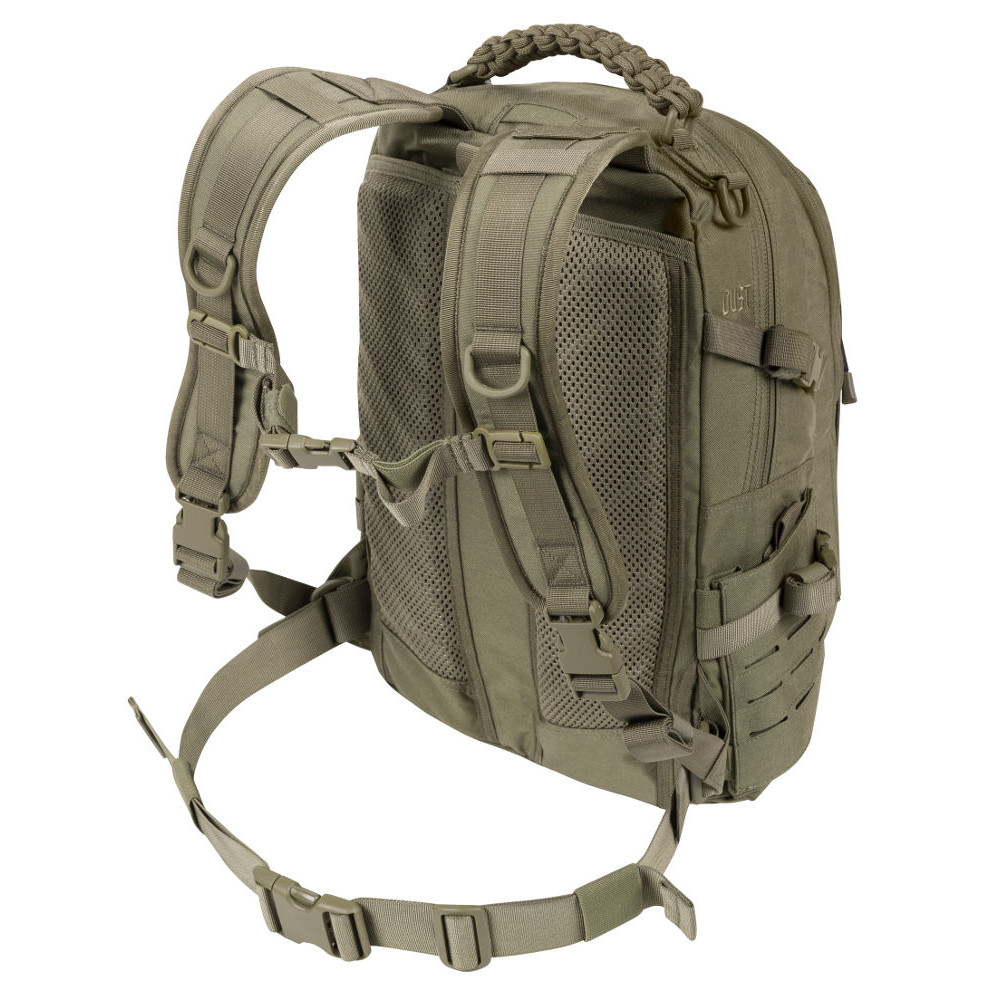 Der Direct Action Dust® Rucksack mit einer Kapazität von 20 Litern ist sowohl für den normalen täglichen Gebrauch, als auch für den taktischen Einsatzzweck geeignet. Das Hauptfach verfügt über eine Trinkblasen-Tasche (Hydration Pack) mit zentrietem Schlauchausgang und eine Netztasche mit Reißverschluss. Dank der Polsterung kann er zum sicheren Transport für Multi-Band-Funkgeräte oder Notebooks bis zu 15 Zoll verwendet werden. Die Vordertasche mit Reißverschluss enthält eine transparente Kartentasche, eine Netztasche mit Klettverschluss und einen Organizer für kleinere Gegenstände. Zusätzliche Seitentaschen können kleine und flache Gegenstände aufnehmen, im geöffnetem Zustand passend für Feldflaschen im US-Standard. Die mit Laser geschnittenen Öffnungen sind MOLLE / PALS kompatibel und machen den Rucksack vollständig modular, bleiben dabei aber unauffällig. Das Federungssystem basiert auf bequemen Schulterriemen und einer Innenversteifung im Rückenteil. Das Material besteht aus strapazierfähigem 500D Cordura® Nylon-Gewebe mit wasserabweisender Beschichtung. Das im Rucksack verwendete innovative Belüftungssystem (Combat-Vent-System®) bietet besseren Trage-Komfort für den Nutzer. Hergestellt aus geschwungenen Schaumstoffprofilen mit mehreren Luftkanälen, in Verbindung mit luftigem CVS®-Netz-Gewebe-Material, trennt es den Rucksack vom Rücken, verbessert die Luftzirkulation und verhindert Wärmestau und Schwitzen, der versteifte Schaum sorgt für mehr Komfort und Stabilität