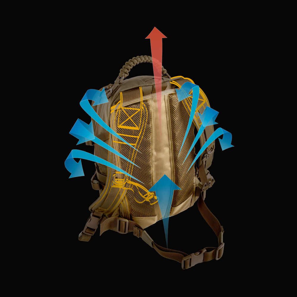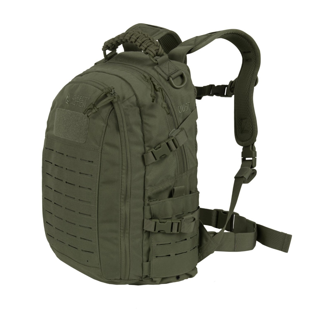 Der Direct Action Dust® Rucksack mit einer Kapazität von 20 Litern ist sowohl für den normalen täglichen Gebrauch, als auch für den taktischen Einsatzzweck geeignet. Das Hauptfach verfügt über eine Trinkblasen-Tasche (Hydration Pack) mit zentrietem Schlauchausgang und eine Netztasche mit Reißverschluss. Dank der Polsterung kann er zum sicheren Transport für Multi-Band-Funkgeräte oder Notebooks bis zu 15 Zoll verwendet werden. Die Vordertasche mit Reißverschluss enthält eine transparente Kartentasche, eine Netztasche mit Klettverschluss und einen Organizer für kleinere Gegenstände. Zusätzliche Seitentaschen können kleine und flache Gegenstände aufnehmen, im geöffnetem Zustand passend für Feldflaschen im US-Standard. Die mit Laser geschnittenen Öffnungen sind MOLLE / PALS kompatibel und machen den Rucksack vollständig modular, bleiben dabei aber unauffällig. Das Federungssystem basiert auf bequemen Schulterriemen und einer Innenversteifung im Rückenteil. Das Material besteht aus strapazierfähigem 500D Cordura® Nylon-Gewebe mit wasserabweisender Beschichtung. Das im Rucksack verwendete innovative Belüftungssystem (Combat-Vent-System®) bietet besseren Trage-Komfort für den Nutzer. Hergestellt aus geschwungenen Schaumstoffprofilen mit mehreren Luftkanälen, in Verbindung mit luftigem CVS®-Netz-Gewebe-Material, trennt es den Rucksack vom Rücken, verbessert die Luftzirkulation und verhindert Wärmestau und Schwitzen, der versteifte Schaum sorgt für mehr Komfort und Stabilität
