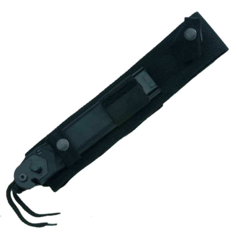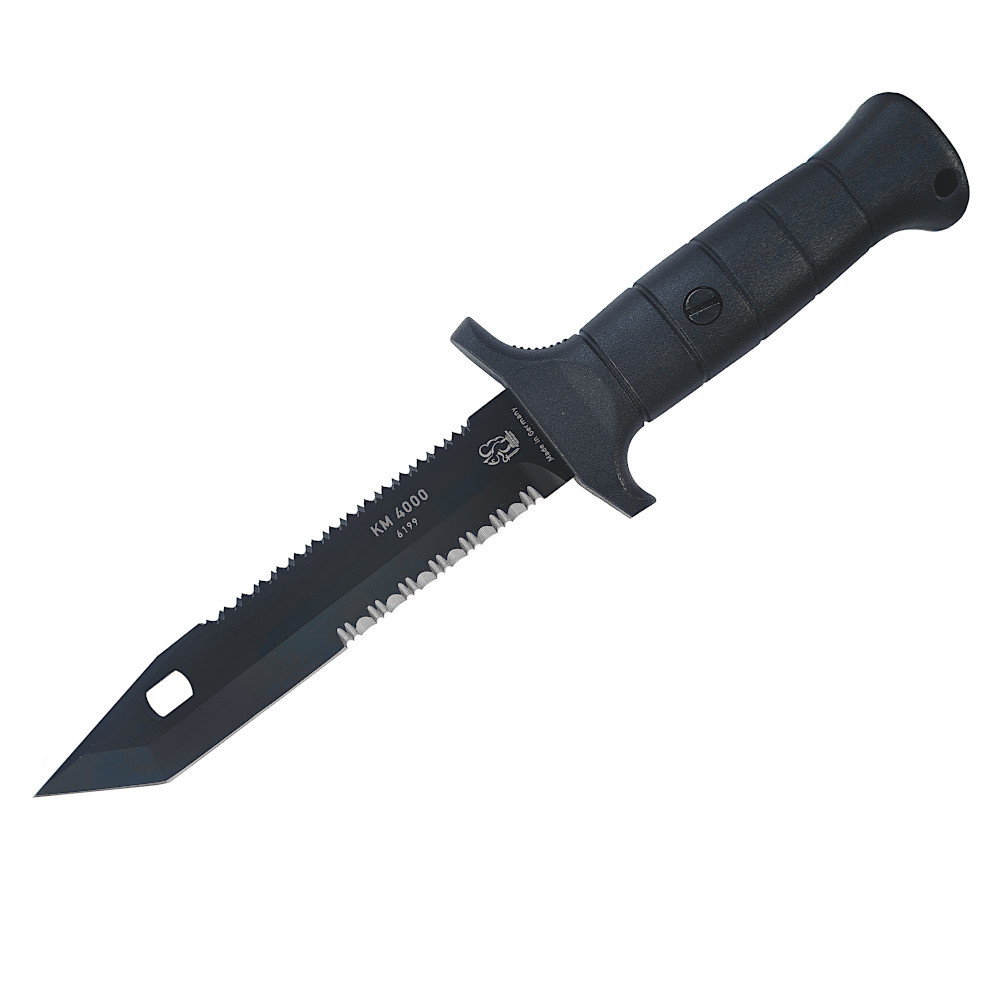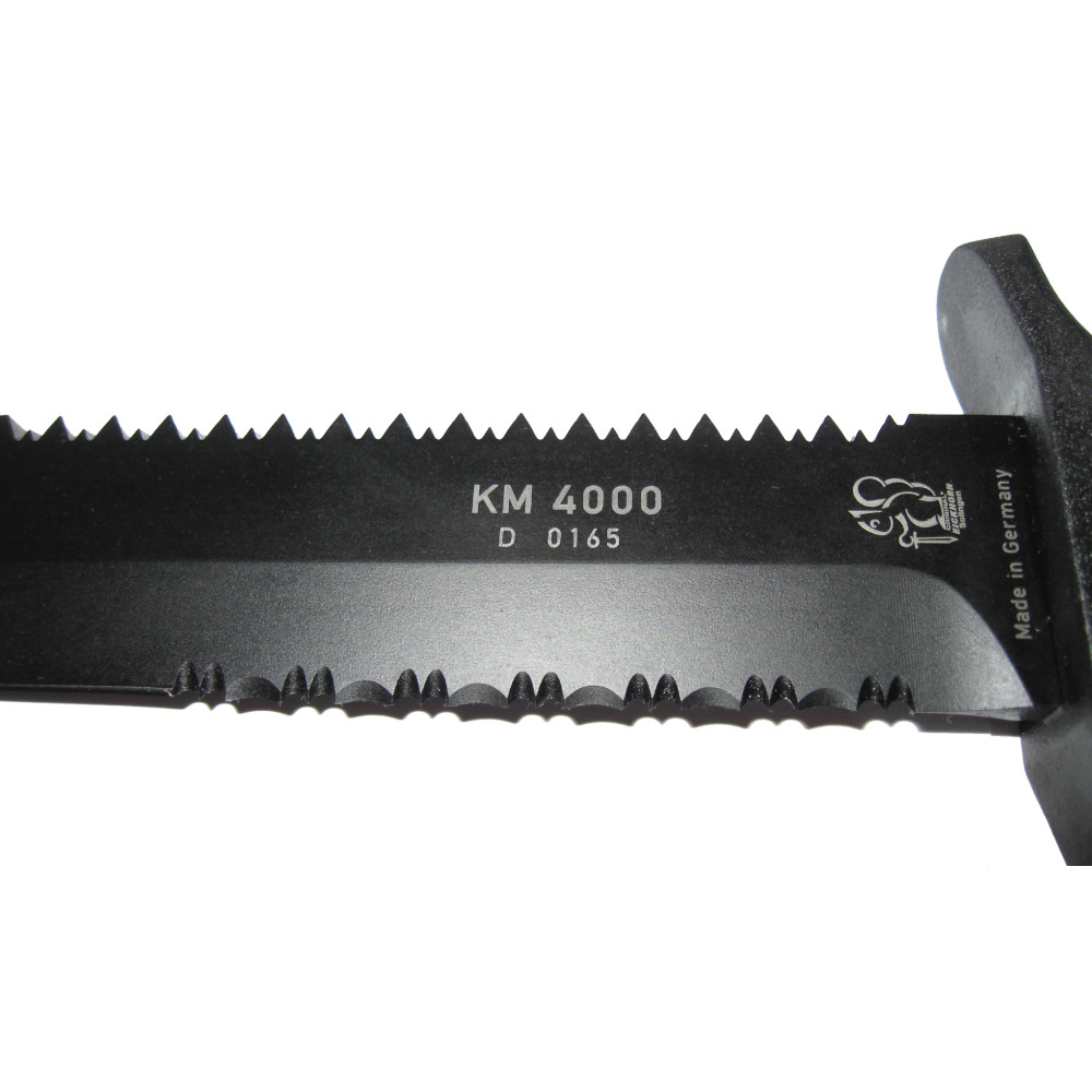 Das Eickhorn KM 4000 Kampfmesser besitzt eine Tanto-Klinge mit schwarzer Kalgard-Beschichtung, einer Rückensäge und einem Drahtschneider. Die Klinge hat zusätzlich einen partieller Wellenschliff. Der glasfaserverstärkte Kunststoffgriff hat einen Glasbrecher auf der Rückseite. Die Kunststoffscheide mit Gurtband und Diamant-Nachschärfplatte passt für alle U.S.-M.O.L.L.E- und IDZ-Tragesysteme der Bundeswehr.