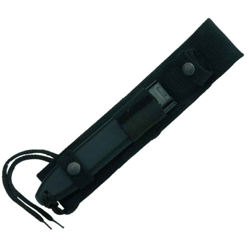 Das Eickhorn KM 2000 Tanto-Kampfmesser mit schwarzer Kalgard-Beschichtung und einem partiellem Wellenschliff. Der Griff aus glasfaserverstärktem Kunststoff mit Glasbrecher an der Rückseite. Die Kunststoffscheide mit Gurtband und Diamant-Nachschärfplatte
