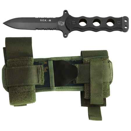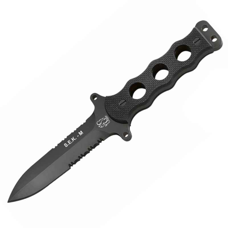 Richtiges Handeln unter Extrembedingungen setzt effektives Training und geeignetes Werkzeug voraus. Insbesondere im Spezialeinsatz können diese beiden Faktoren über Leben oder Tod entscheiden. Einsatzberichte militärischer und polizeilicher Experten haben Designer Dietmar Pohl davon überzeugt, für dieses spezielle Sondereinsatz-Kappmesser eine Dolchklingenform zu wählen. Die Vorteile liegen buchstäblich in der Hand: Unter Stress darf sich der Anwender keine Gedanken darüber machen, wo sich die scharfe Seite der Klinge befindet. Sekundenbruchteile entscheiden. Des Weiteren lässt sich mit einer Dolchklinge in ziehender oder drückender Bewegung schneiden. Der nach beiden Seiten stark ausgeprägte Handschutz wurde bewusst rechtwinklig gestaltet, um die Hand optimal zu schützen (Hammergriffhaltung). Der 10,5 cm lange Griff ist bestens für den Gebrauch mit Handschuhen abgestimmt. Um optimale Griffsicherheit zu gewährleisten, wählte Eickhorn G-10-Schalen mit Rough Grip-Oberfläche für das S.E.K. Drei große Löcher im Griff erhöhen nicht nur die Griffsicherheit, sondern geben dem Messer auch die nötige Gewichtung. Zwei kleinere Löcher am Griffende dienen zur Befestigung einer Sicherungsschnur. Aggressives Salzwasser stellt ganz besondere Anforderungen an Stahlklingen, insbesondere was deren Beständigkeit gegenüber Korrosion angeht. Um das S.E.K. auch für maritime Spezialaufgaben einsetzen zu können, erhielt die gesamte Oberfläche eine extrem widerstandsfähige DLC-Kohlenstoffbeschichtung (Diamond-Like-Carbon). Der partielle Wellenschliff macht kurzen Prozess mit Tauwerk und Fischernetzen. Eine Cordura-Scheide in Flecktarn mit Kunststoffeinsatz erlaubt variable Befestigungsmöglichkeiten.