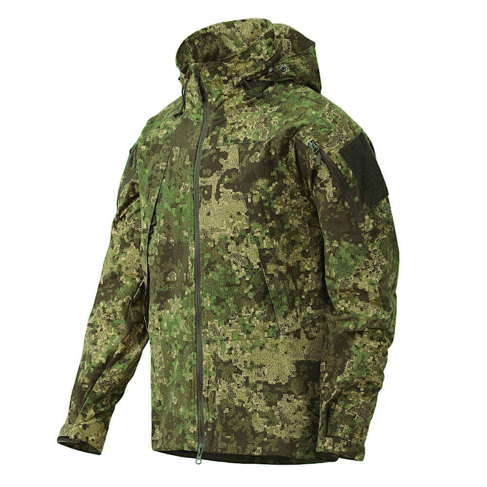 Die Trooper Mk2 ist eine leichte Outdoor-Jacke mit einem praktischen Design. Dank des leicht elastischen Hauptmaterials bietet sie uneingeschränkte Bewegungsfreiheit. Sie eignet sich gut als taktische Jacke, was durch die Klettverschlüsse an den Schultern und die Betonung der Funktionalität deutlich wird.