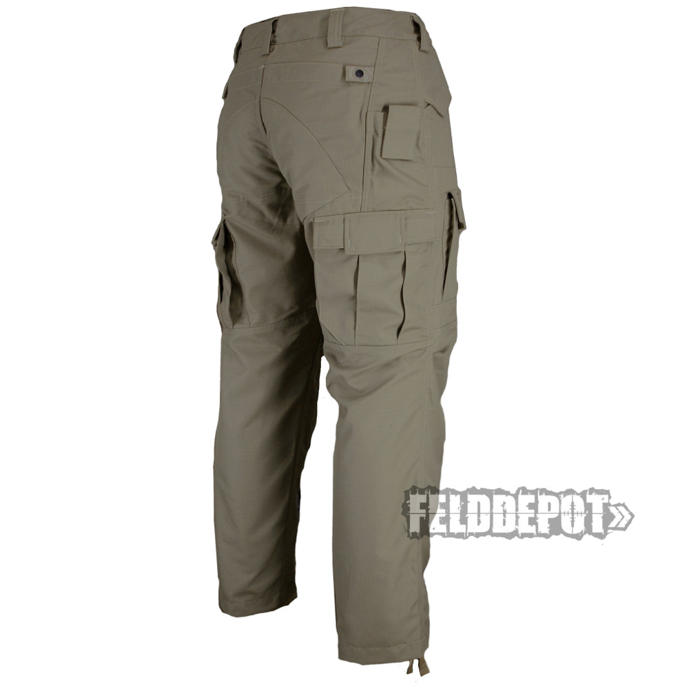 - 2 große Gesäßtaschen mit Druckknopf und Schlaufe (bei geöffneter Schlaufe zur Aufnahme von Magazinen)