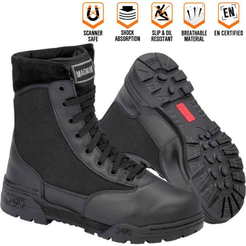 Der Magnum Classic Einsatzstiefel ist ein seit Jahren bewährter Einsatzstiefel bei Polizei und Sicherheitsdiensten. Der Schaft des Classic Regular ist mit 8‘‘ etwas höher als bei der Mid-Version und bietet eine angenehmes Tragegefühl bei langen Einsätzen.