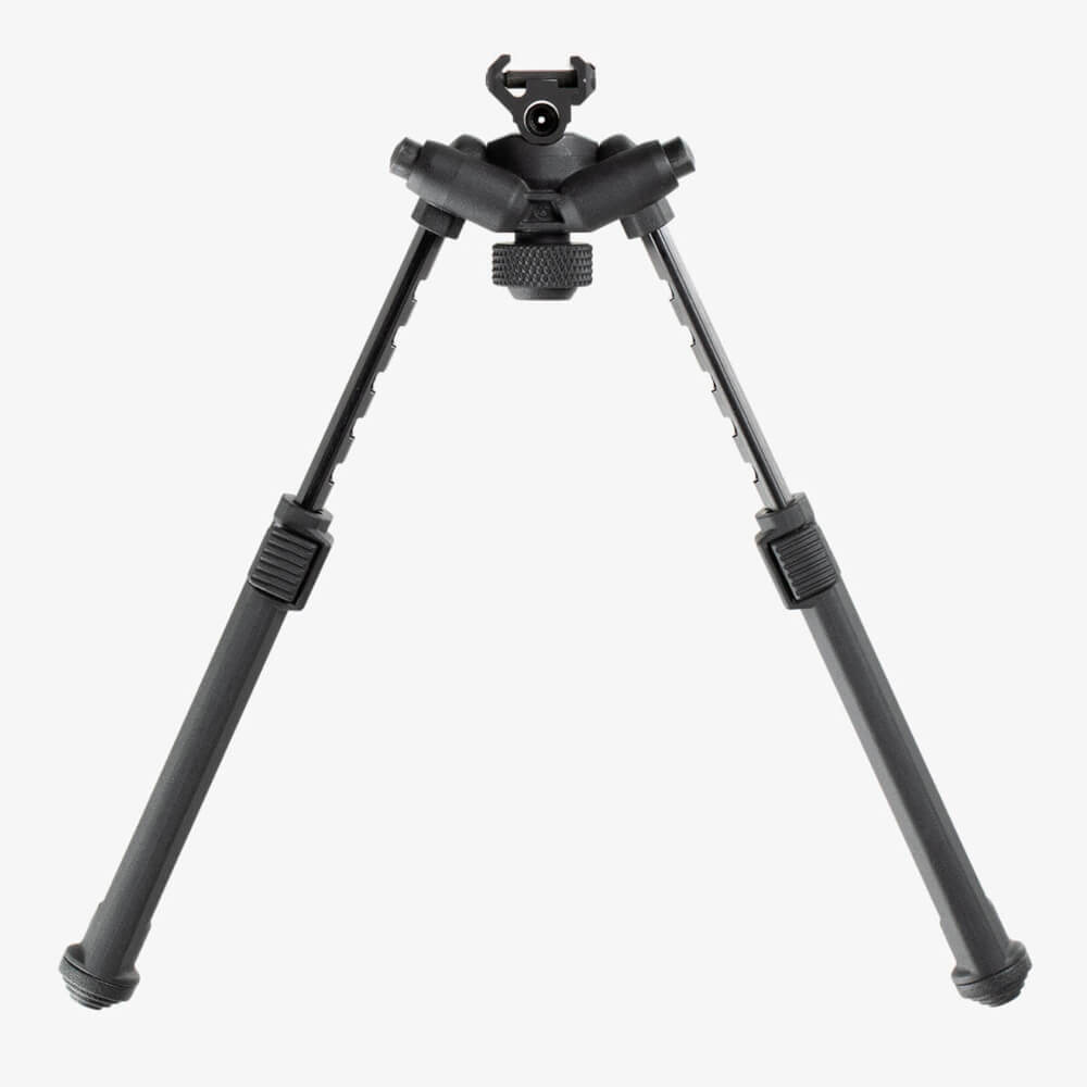 Die Beinverlängerungen gleiten und verriegeln sicher mit einem Knopfdruck auf eine der sieben im Abstand von einem halben Zoll angeordneten Verriegelungsrasten. Die Beine lassen sich um 3,5 Zoll verlängern, von 6,8" bis 10,3". Der branchenweit einzigartige Neigungswinkel von 50° und der Schwenkwinkel von 40° werden über einen handschuhfreundlichen, gerändelten und werkzeuglosen Zweibein-Verriegelungsknopf zwischen den verlängerten Beinen gesteuert. Außerdem kann der Schwenkbereich bei 0° arretiert werden, während die Neigefunktion voll erhalten bleibt. Zusammengeklappt passen das stromlinienförmige Gehäuse und die Beine genau unter den Lauf und sind nur knapp 2,3" tief und 3,3" breit. Eloxierte Oberflächen und enge Präzisionstoleranzen verringern ein Quietschen und Klappern.