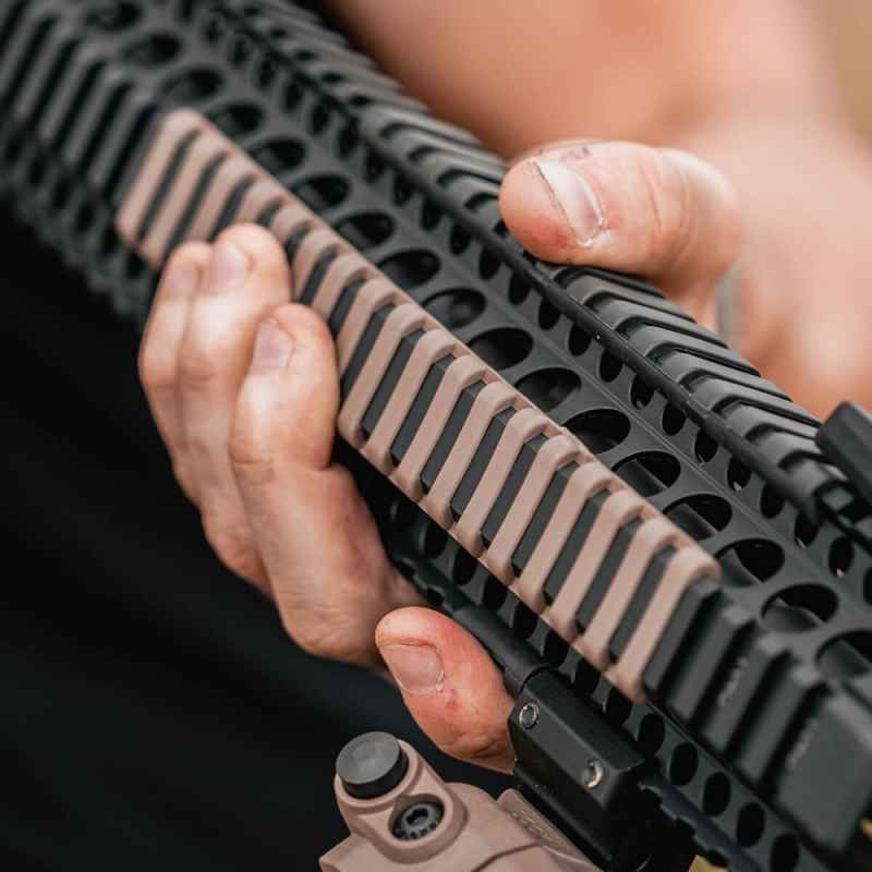 Ladder Panels bieten eine sehr flache 1913 Picatinny-Schienenabdeckung. Das Santoprene-Material bietet eine gummiartige Oberfläche für verbesserte Waffenkontrolle und Schienenschutz.
