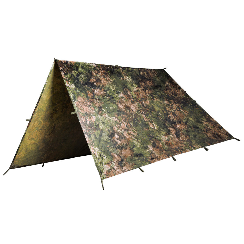 Die Mehrzweckplane für Biwaks mit 19 Befestigungspunkten bietet viele Konfigurationen, passend für alle Umgebungen. Das 1500g leichte Tarp aus Ripstop-Gewebe besitzt eine Wassersäule von 5000mm und eignet sich als Zeltersatz, Regen- oder Sonnenschutz, sowie als Unterlage oder Bergeplane. Verpackt wird das Tarp in einem passenden Transportbeutel.