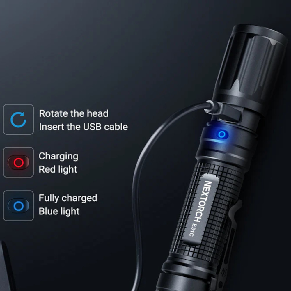 Aufgeladen wird die NEXTORCH E51C über einen integrierten USB-C-Anschluss, der wasserdicht unter einem Schraubverschluss verborgen ist.
