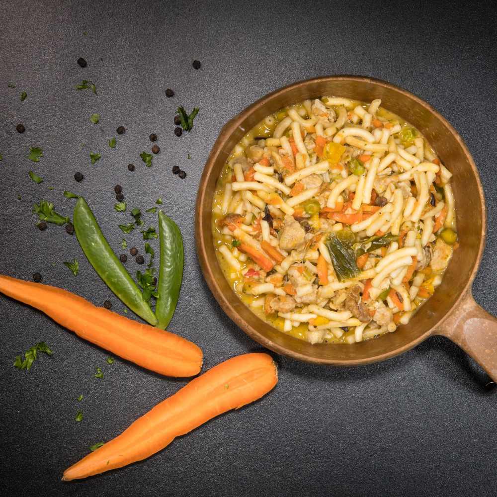 Nudeln mit gebackenem Hähnchen, wo Kokosmilch und unterschiedliche Gewürze einen angenehmen Geschmack verleihen. 100% natürlich, ohne Konservierungs- und Zusatzstoffe.