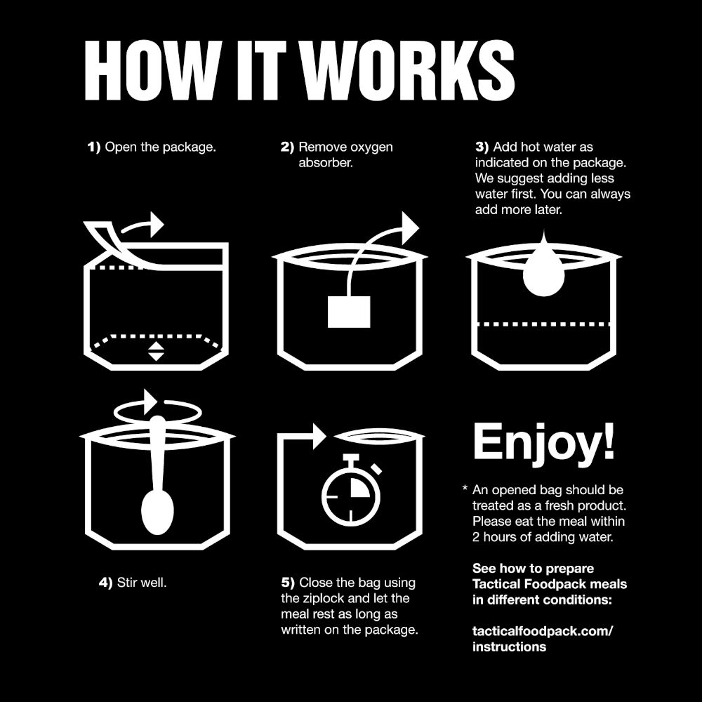 Rindfleisch-Kartoffeltopf ist Tactical Foodpacks Variante vom Prager Gulasch. Unter Zugabe von Kümmel, der der Speise zusätzlich eine angenehme Note verleiht. Estnischer Herkunft und 100% natürlich, ohne Konservierungs- und Zusatzstoffe.