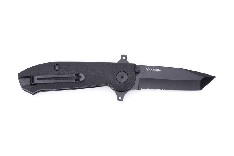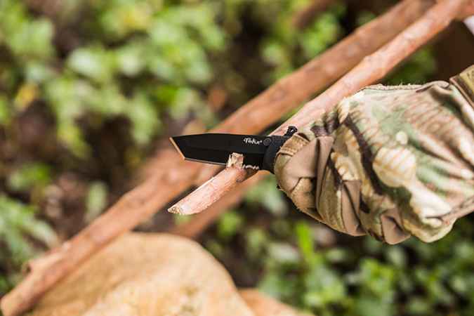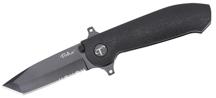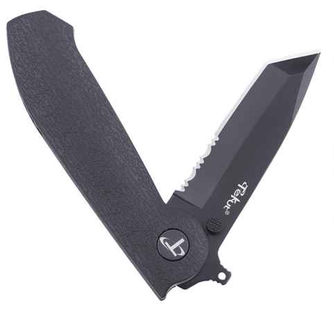 Die robuste Tanto-Klinge aus rostfreiem Sandvik 12C27 Edelstahl mit partiellem Wellenschliff ist allen Anforderungen in jeder Situation gewachsen.