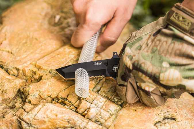 Durch den patentierte MobiLip™ Edelstahl-Halteclip kann das neue TEKUT Ares optimal in der Tasche versenkt werden: Kaum ein anderes EDC-Messer lässt sich gut verdeckt tragen, wie das TEKUT Ares! Der auch bei Nässe rutschfeste Griff erlaubt problemlos verschiedene Griffhaltungen, zum Beispiel beim Sägen.