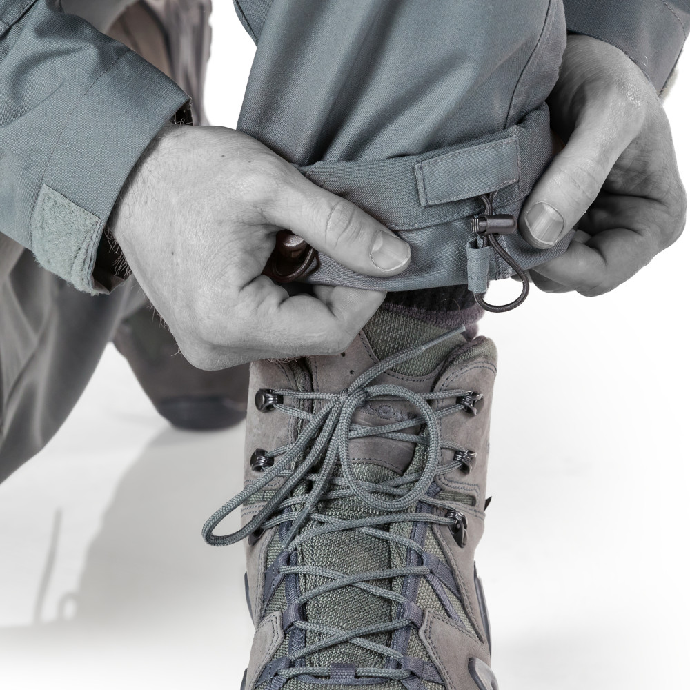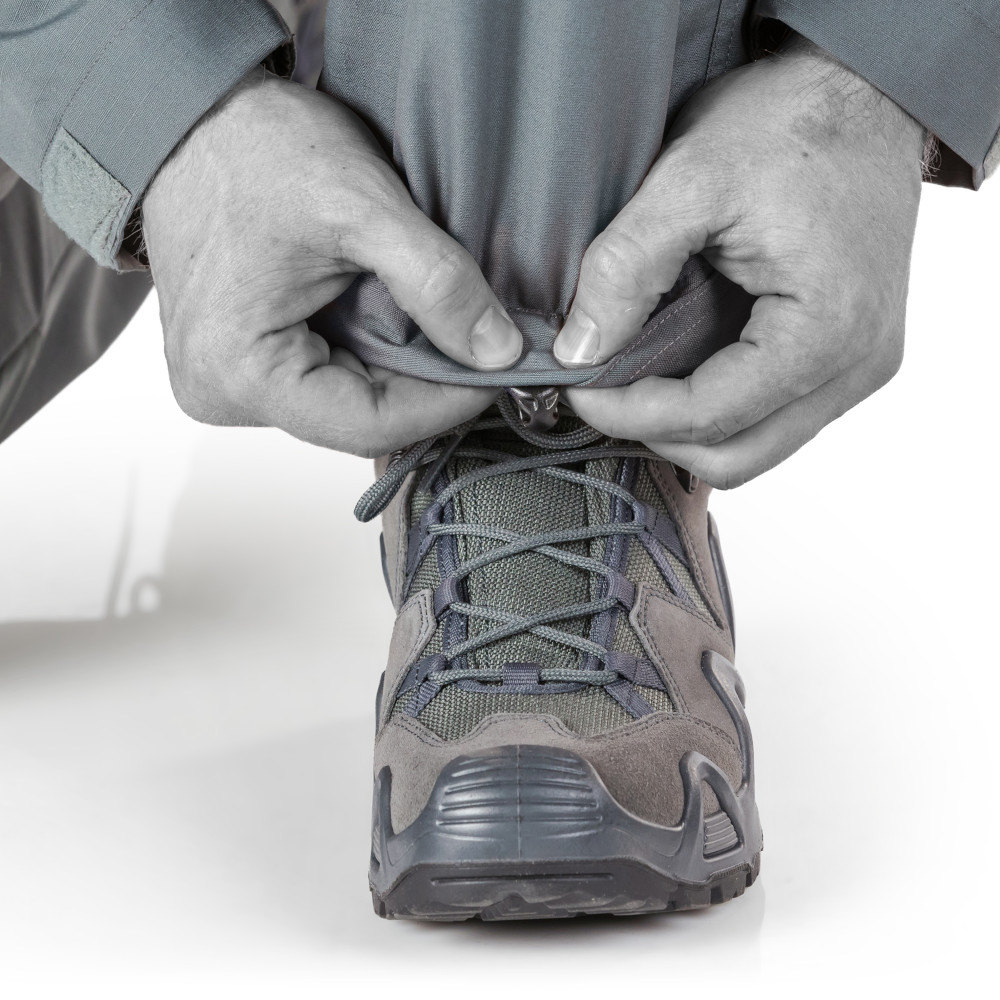 Schiebe Deinen Gürtel durch die CORDURA®-verstärkten Doppelschlaufen der Hose (damit wird verhindert, dass der beladene Gürtel durchhängt). Verwende anschließend den Haken an der Unterseite der Hosenbeine, um die Hose mit Deinen Stiefeln zu verbinden (damit der Stoff nicht hochrutscht und Deine Waden freilegt).