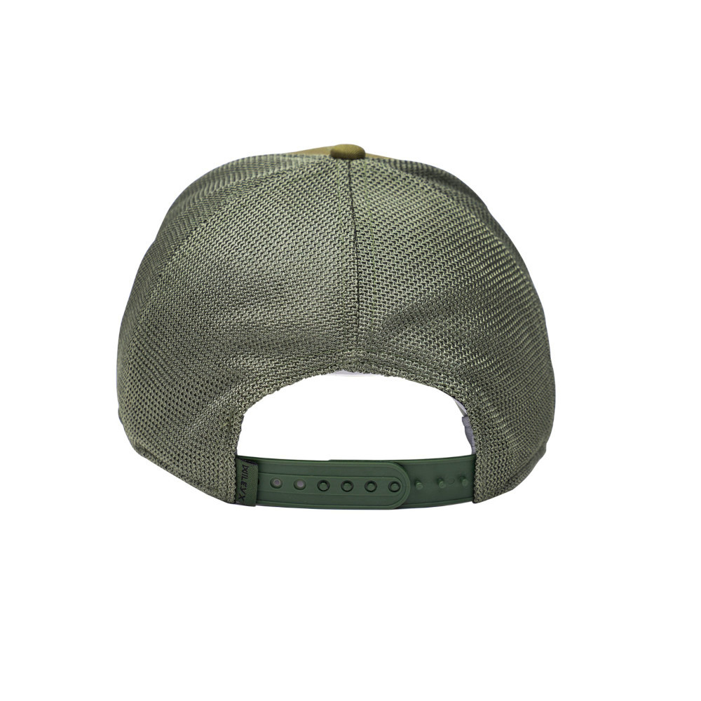 Das Trucker-Cap verfügt über ein Mesh-, Front- und Schirm-Design in einer komplett olivgrünen Farbe für einen coolen und schnittigen Look. In der Mitte der Vorderseite ist ein schwarzes Wiley X-Logo zu sehen, das sich perfekt in das grüne Gesamtbild der Kappe einfügt.