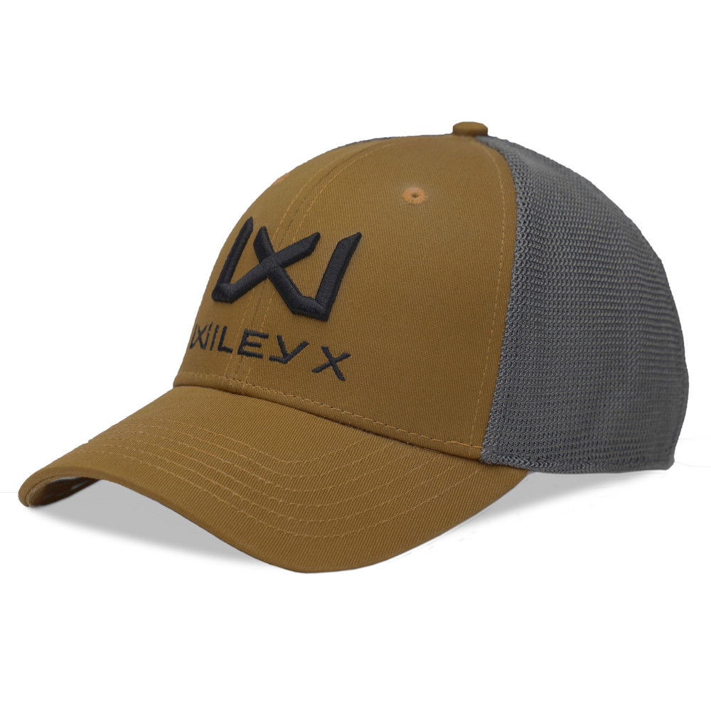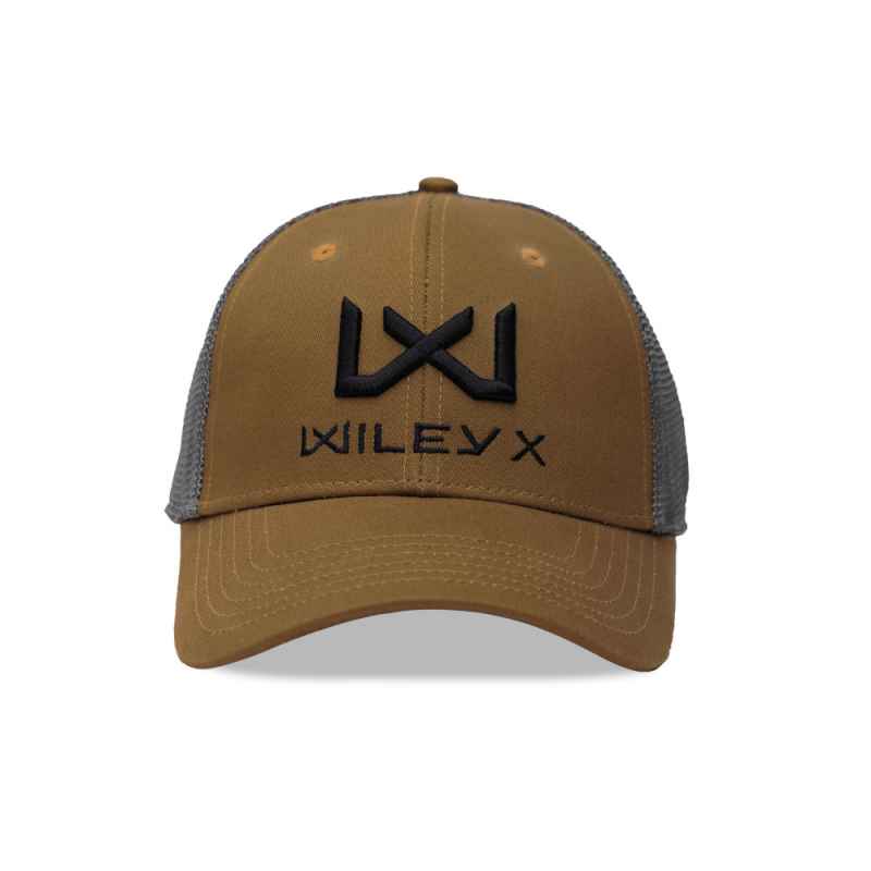 Das Trucker-Cap hat ein hellbraunes Front- und Schirmdesign, während das Mesh der Kappe in einem grauen Farbton gehalten ist. In der vorderen Mitte ist ein schwarzes Wiley X-Logo zu sehen. Die drei Farben werden perfekt kombiniert, um sowohl das Hellbraun der Wüstenuniformen der Armee mit den schwarz/grauen Farben der urbanen Szene zu mischen, was der Kappe ein stilvolles Design verleiht.