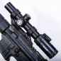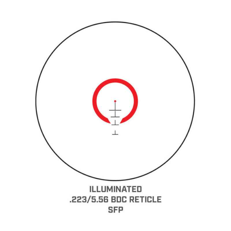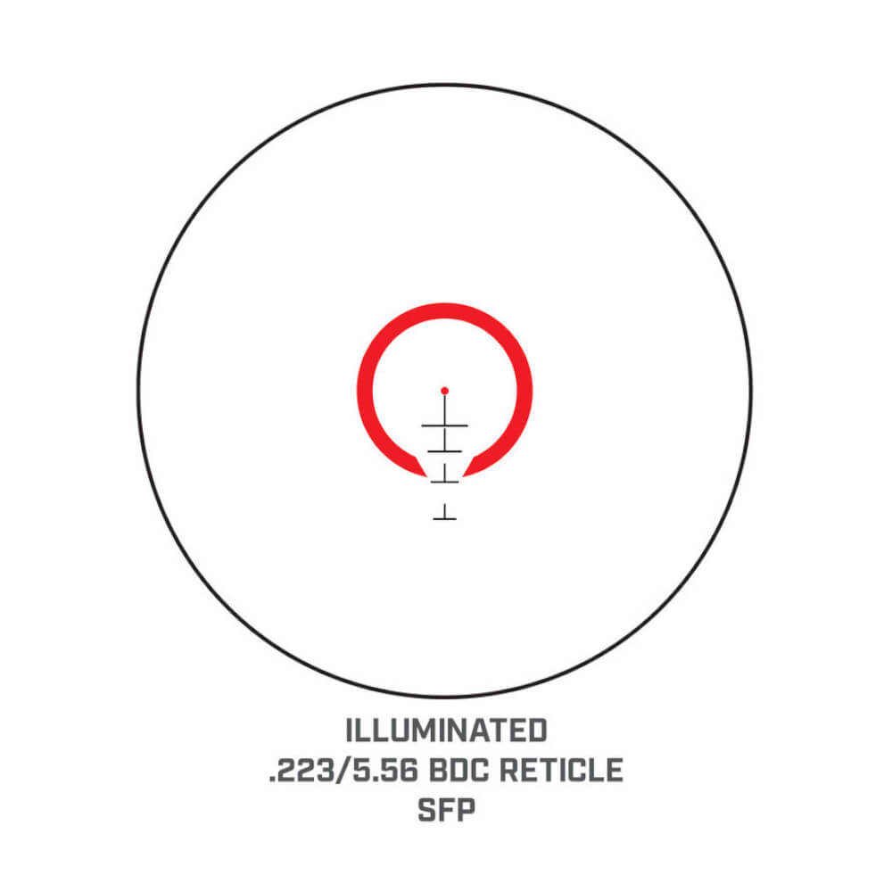 The illuminated BTR-1 BDC reticle has drop points to acquire targets at distances of up to 500 yards with standard .223 Remington /5.65 mm NATO caliber ammunition.