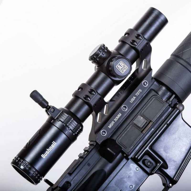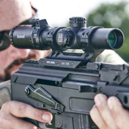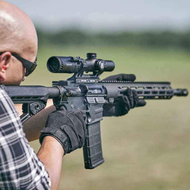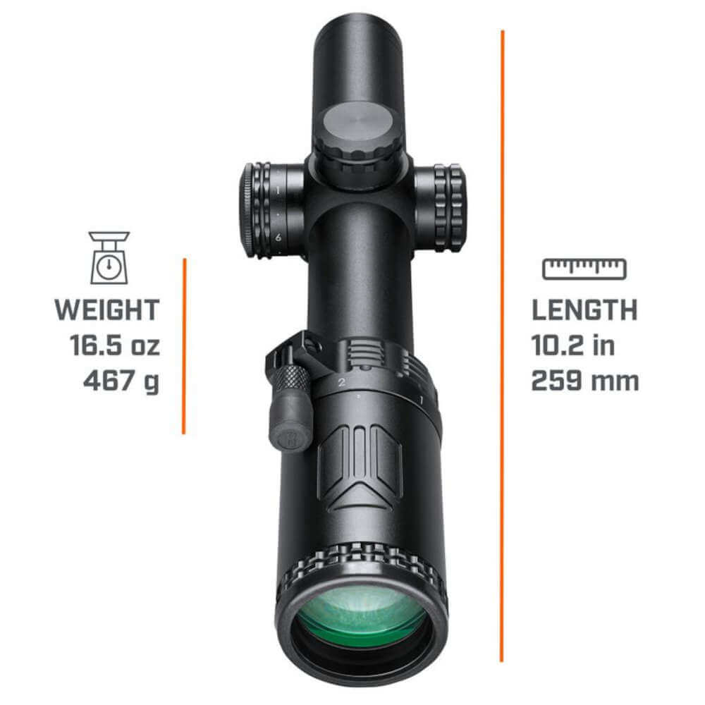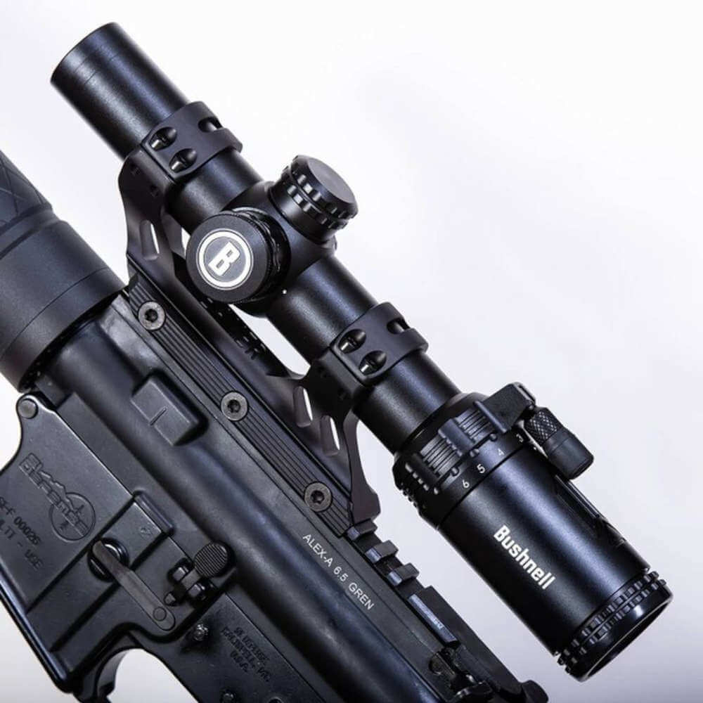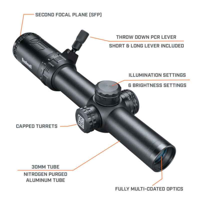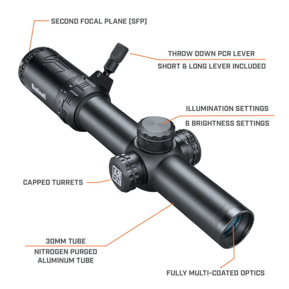 The Bushnell AR Optics 1-6x24mm riflescope with illuminated BDC reticle, equipped with two Throw Down Power Change levers for easy magnification changes, enables fast and precise target acquisition.