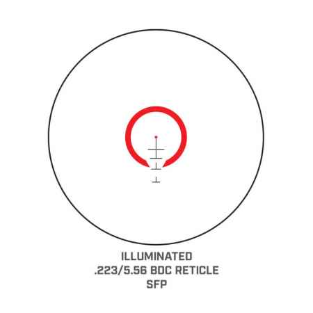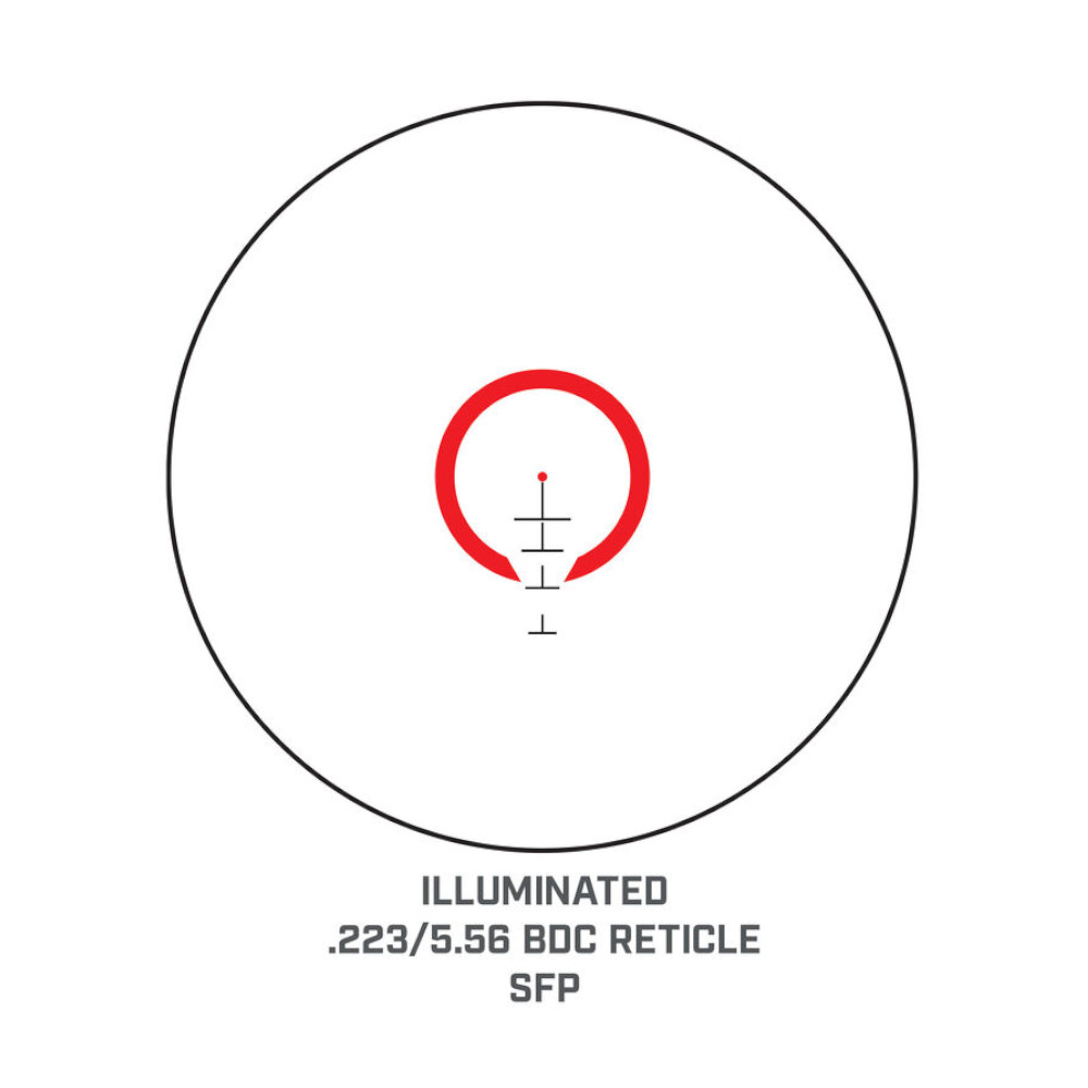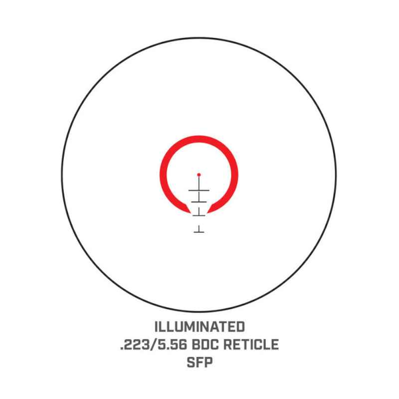 The illuminated BTR-1 BDC reticle has drop points to get you on targets out to 500 yards with standard .223 Rem./5.56 NATO Ammunition.