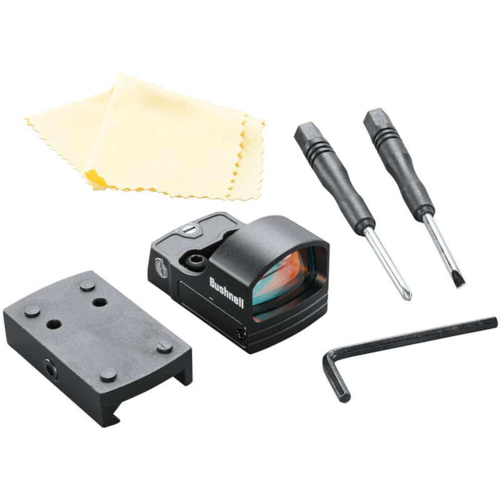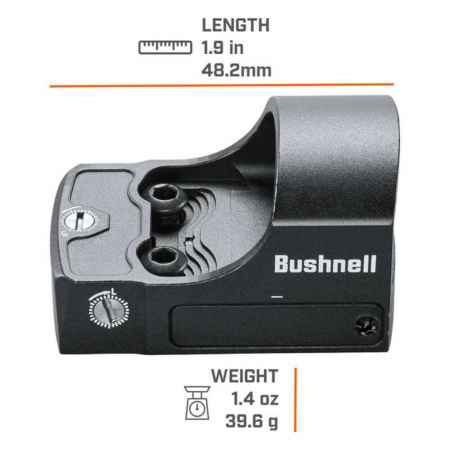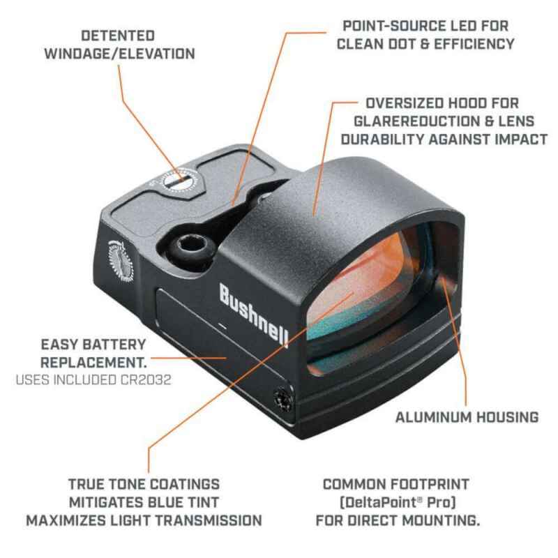 The Bushnell RXS-100 Reflex Sight produces a clean 4-MOA dot and offers 5,000 hours of operation at medium brightness settings. Battery replacement is accomplished via the side charging door , so you don't have to remove the sight from the weapon, allowing you to maintain your adjustment. Eight brightness levels ensure clear vision in daylight and excellent visibility at night.The Bushnell RXS-100 reflex sight comes with a low-profile mount and is compatible with any DeltaPoint® footprint mount. The RXS-100 can therefore be easily mounted on a variety of pistols, rifles and shotguns.