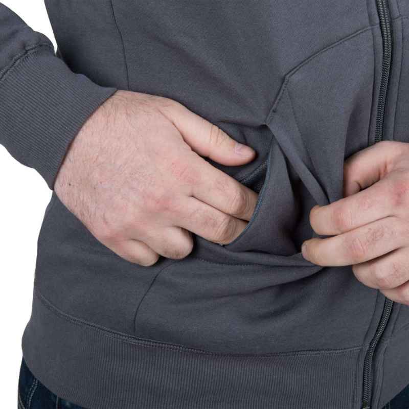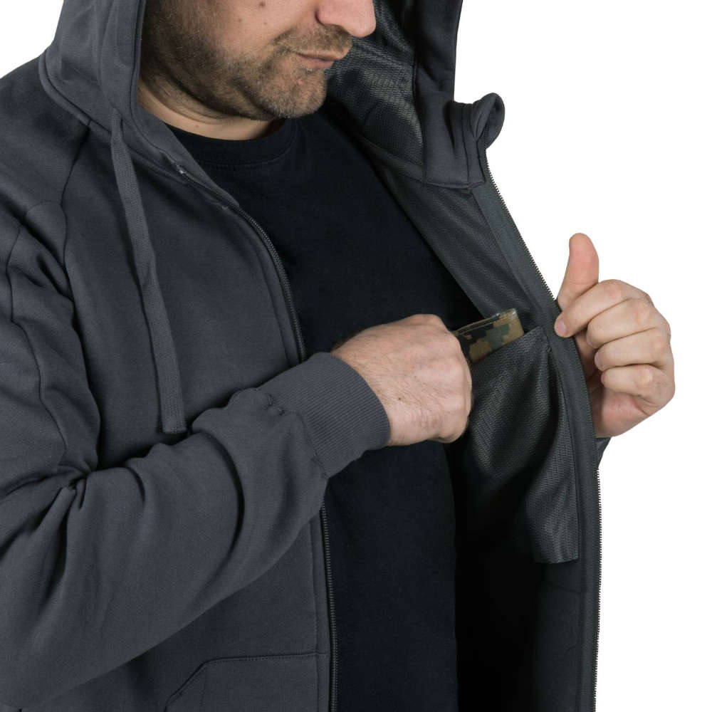 URBAN TACTICAL HOODIE LITE® is a lightweight, full zip hoodie jacket. Simple, low profile cut and elastic fabric make this jacket perfect for any urban operations. Two classic front pockets will accommodate all your essentials to which you need quick and easy access, but can also work as a hand warmer pockets in cold days. Additionally in the right pocket there is a hidden inner pocket closed with a zipper. Two inner mesh pockets will fit your wallet or documents, preventing them from being stolen or lost. On left shoulder there is one more hidden pocket with the zipper specially concealed in one of the stitchings.