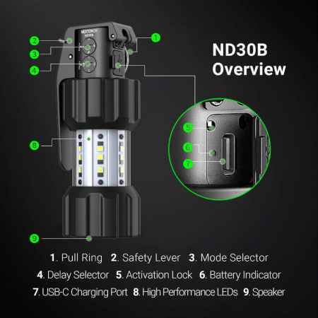 The Nextorch ND30B electronic flashbang is an innovative tactical irritant for professional use and training purposes. With a deafening 130 dB alarm and an intense 11,000 lumen strobe flash, the ND30B offers an over-the-counter alternative to traditional flashbangs. Designed for indoor and outdoor use, its rechargeable and rugged construction makes it ideal for domestic combat training or technical exercises.Advantages over conventional flashbangs