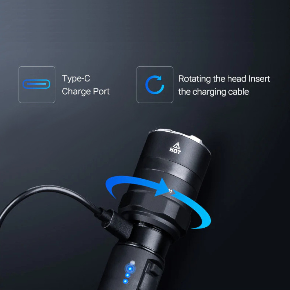 The scope of delivery of this robust LED flashlight includes an extra-strong battery as a matter of course. This battery is charged via an integrated USB-C port wherever there is a USB-C port: