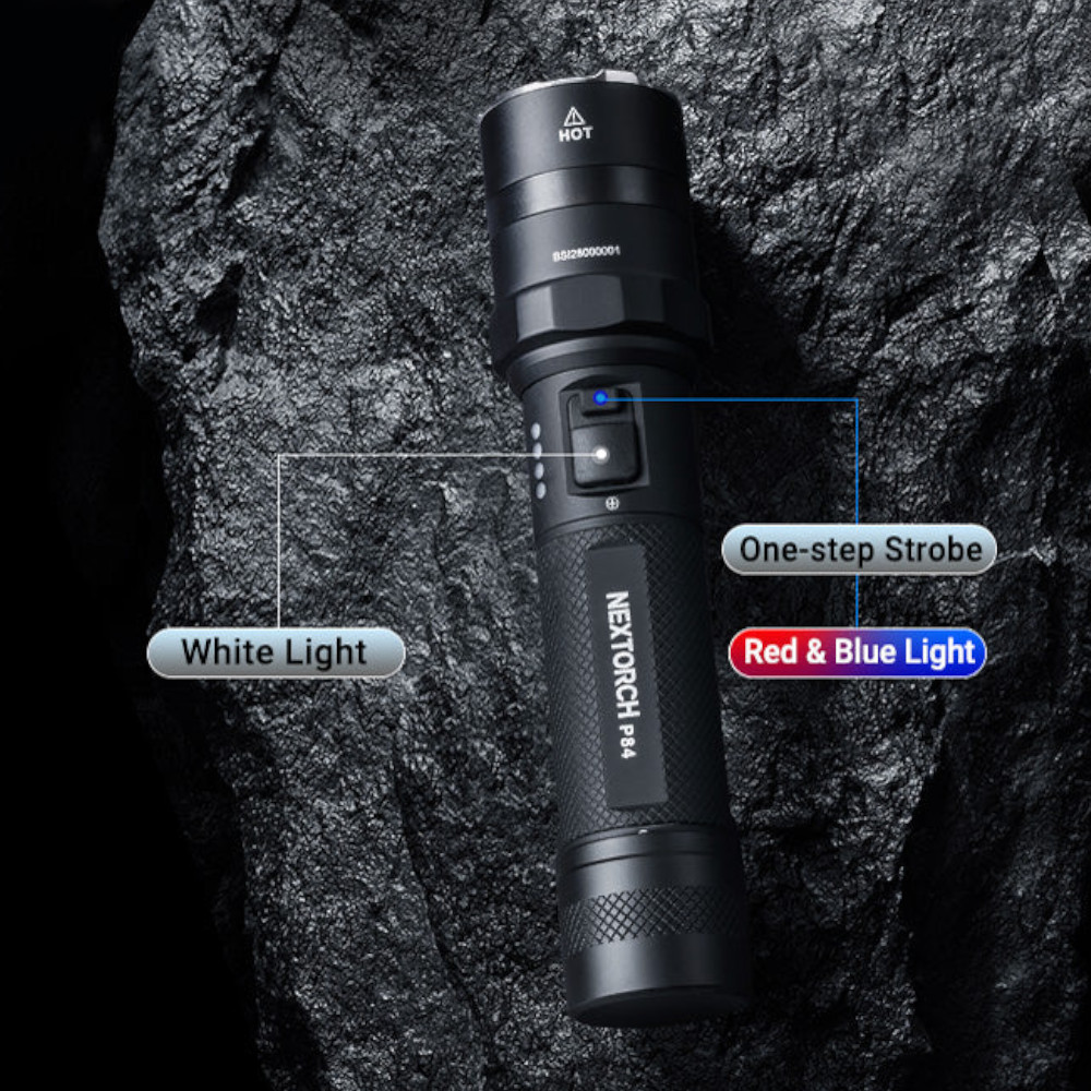 In addition to the normal light, the NEXTORCH P84 B can even be used as a rotating beacon with optimal 360° signal effect. For this purpose, the P84 B flashes the warning light in red and blue far visibly in all directions. In addition, the P84 B optionally shines in only red or only blue, both flashing and as a continuous light.
